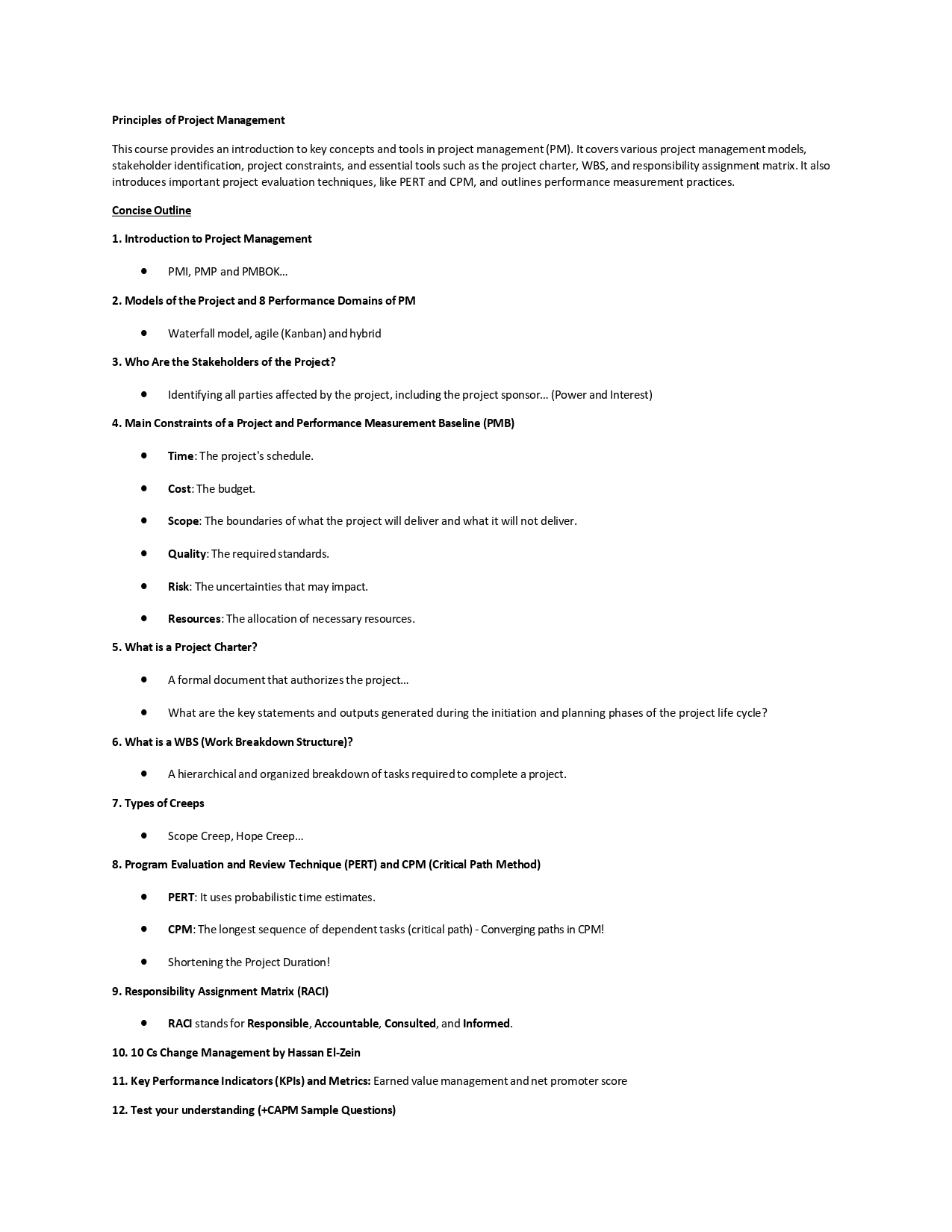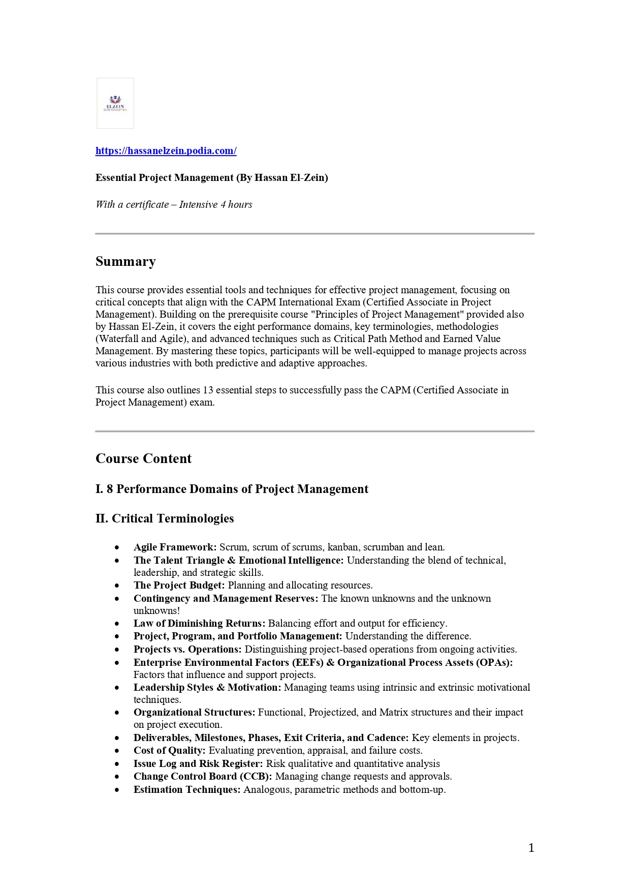 This course provides essential tools and techniques for effective project management, focusing on critical concepts that align with the CAPM International Exam (Certified Associate in Project Management). Building on the prerequisite course "Principles of Project Management" provided also by Hassan El-Zein, it covers the eight performance domains, key terminologies, methodologies (Waterfall and Agile), and advanced techniques such as Critical Path Method and Earned Value Management. By mastering these topics, participants will be well-equipped to manage projects across various industries with both predictive and adaptive approaches.