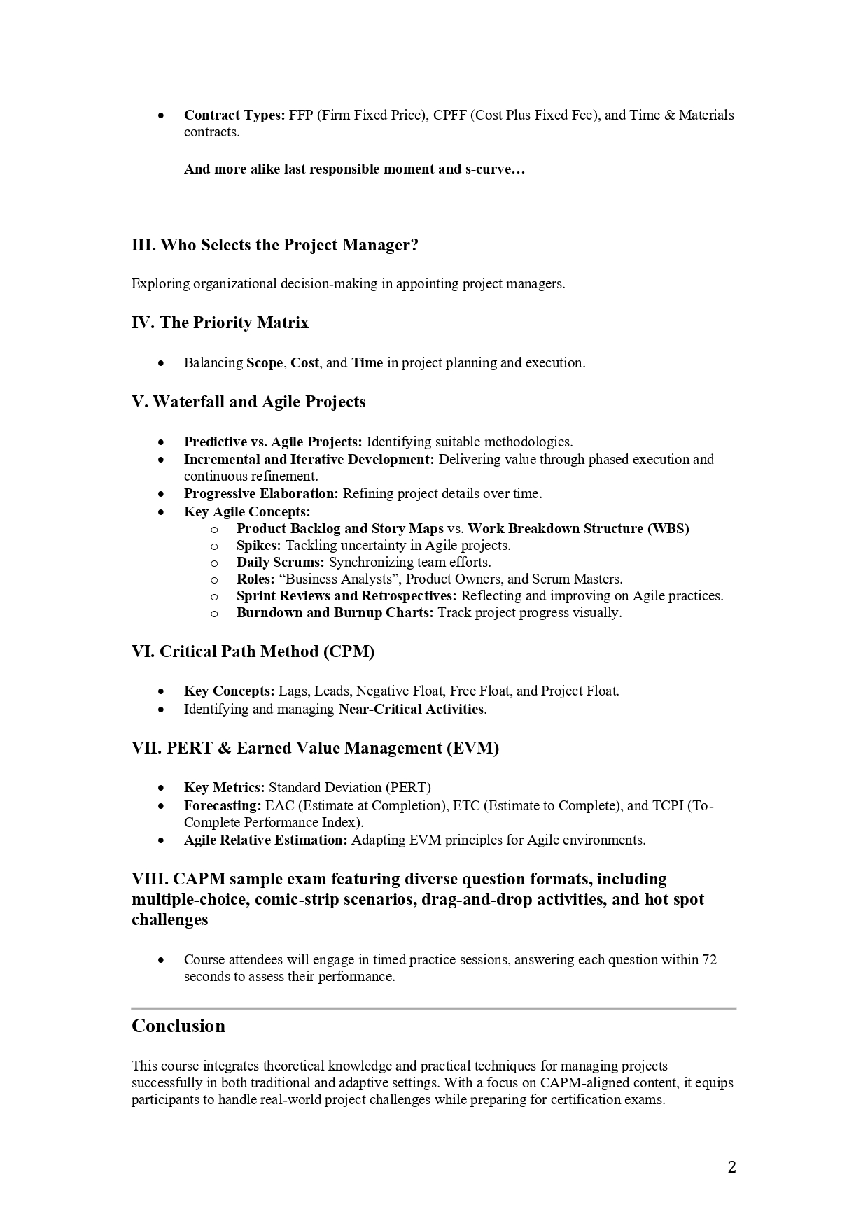 This course integrates theoretical knowledge and practical techniques for managing projects successfully in both traditional and adaptive settings. With a focus on CAPM-aligned content, it equips participants to handle real-world project challenges while preparing for certification exams.